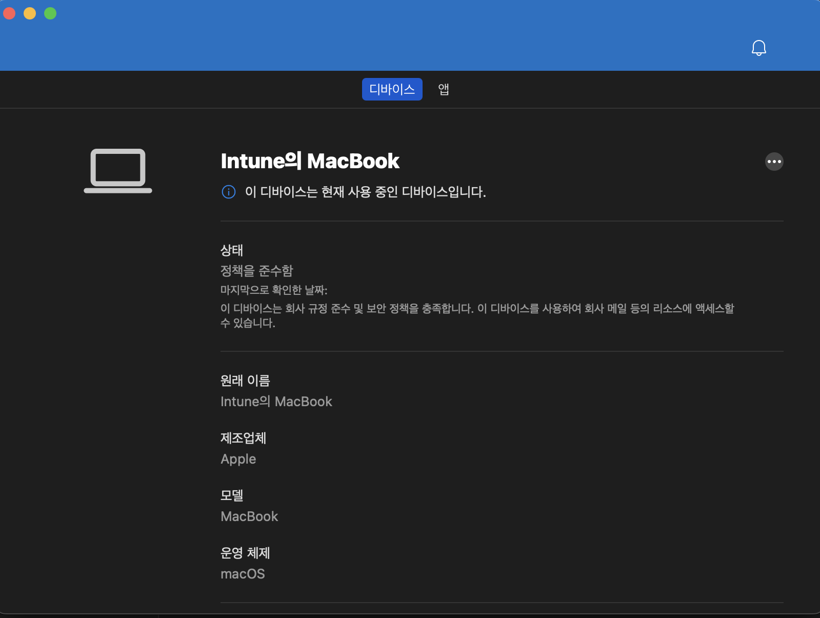 Intune > Devices > macOS devices로 가보면 기기가 정상적으로 등록되어 있는 것을 확인할 수 있습니다.