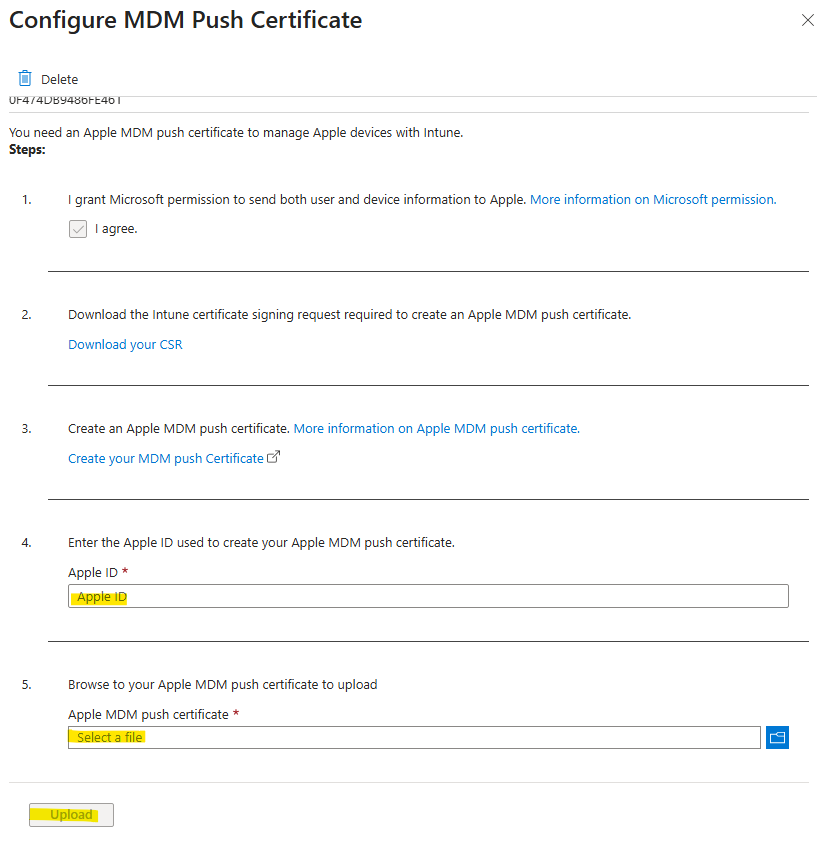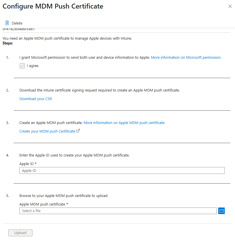 먼저, Intune 포털 > Devices > macOS > Enrollment > Apple MDM Push Certificate 에서 인증서를 등록해야 합니다.
