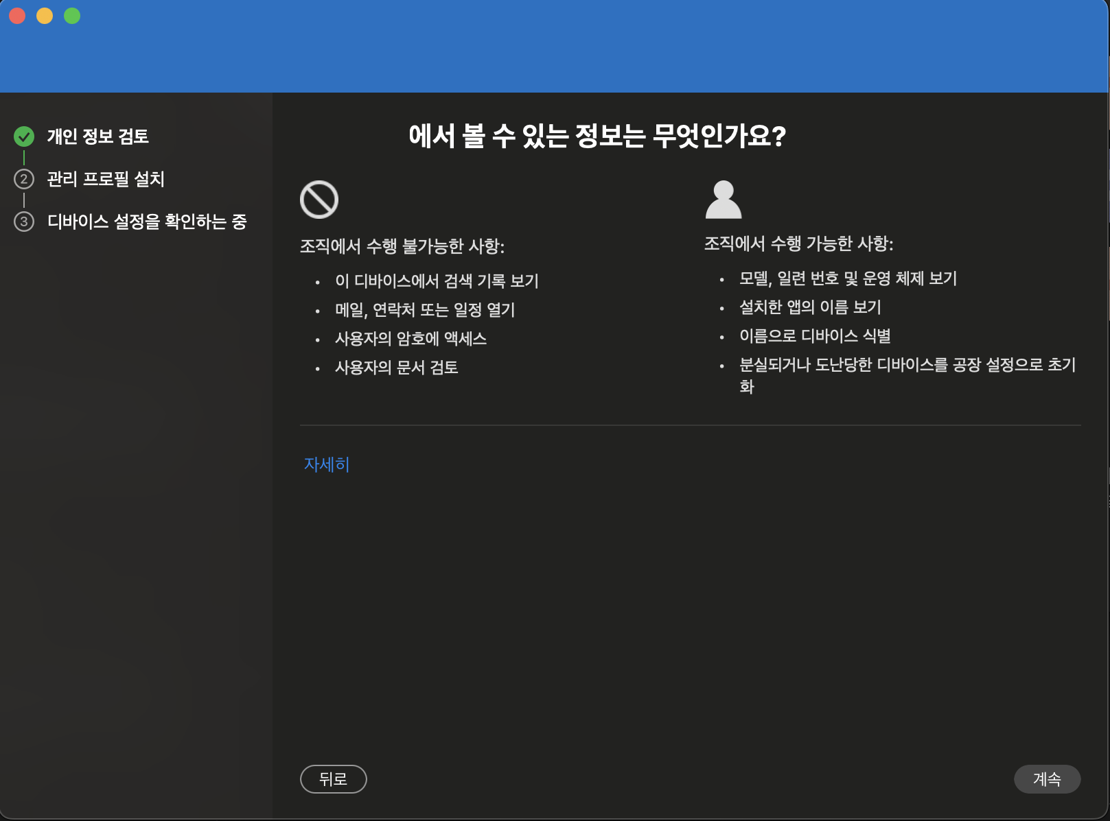 '시작' 버튼을 눌러 조직에서 수행 가능한 항목을 확인하고 '계속' 버튼을 누릅니다.
