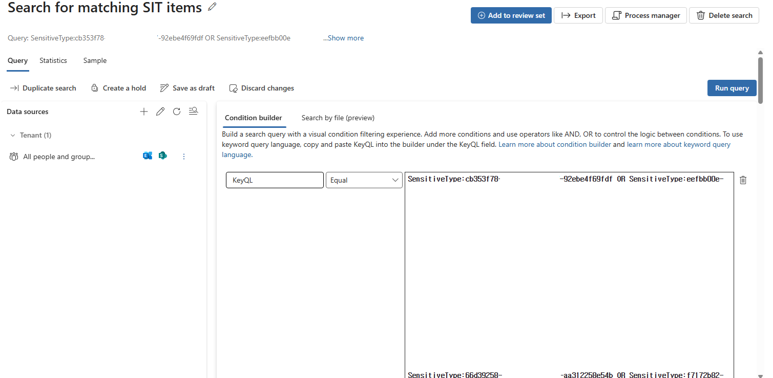 SensitiveType 속성과 함께 해당 SIT의 고유 ID(GUID) 값을 명확히 지정해야 KeyQL로 검색할 수 있습니다.